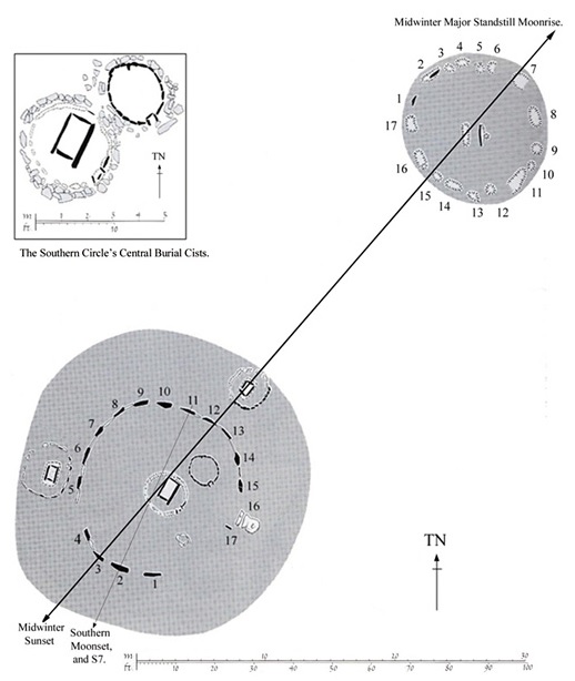 It is thought that the southern circle was erected after the northern circle The line connecting the centre of the circles forms an axis running NE-SW, and coincides with the alignment of the southern circle's three burial cists.