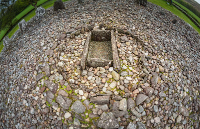 It was constructed over a stone cist in which cremated bones were found. The cairn was surrounded by a stone circle constructed out of 22 massive stone and is about 40 feet (twelve metres) in diameter. Three of these stones have been carved: one with a number of concentric circles; another with two spirals - one on each of two adjoining faces with the ends of the spirals meeting at the edge; and a third with cup-marks. Two cairns were built over cists outside the stone circle. Later a large cairn was built up which covered the inner cairn, the stone circle and the two outer cairns. Post holes from another stone circle were found just a little way from the main Temple Wood circle. You can find more great photographs of this cairn on this The dating of this complex is uncertain. Originally it was thought that the site was built around 4000 BC, but it is now believed that it is more likely that the site was built in the early Bronze Age.
